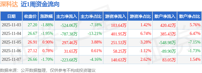 资金流向数据方面,本周深科达主力资金算计净流出1206.02万元,游资资金算计净流入956.0万元,散户资金算计净流入250.02万元。本周资金流向一览见下表: